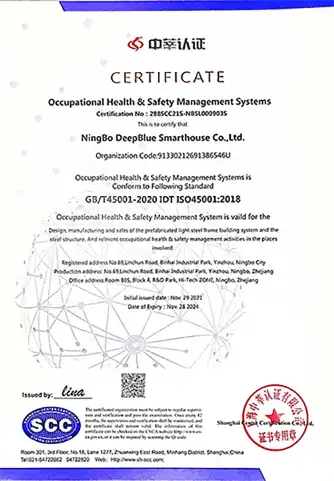 Occupational Health & Safety Management Systems is vaild for the Design, manufacturing and sales of the prefabricated light steel frame building system and the steel structure. And relvant occupational health & safety management activities in the places involved.